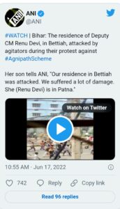 ଅଗ୍ନିପଥ’ ଯୋଜନା ନେଇ ବଢୁଛି ବିରୋଧ : ବିହାରରେ ଉପମୁଖ୍ୟମନ୍ତ୍ରୀଙ୍କ ବାସଭବନ ଉପରେ ଆକ୍ରମଣ ସହ ରାଜ୍ୟ ବିଜେପି ଅଧ୍ୟକ୍ଷଙ୍କ ଘର ଜାଳି ଦେବାକୁ ଉଦ୍ୟମ