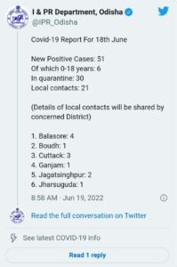 ଗତ ୨୪ ଘଣ୍ଟା ମଧ୍ୟରେ ବାଲେଶ୍ବର ଜିଲ୍ଲାରୁ ୪ ଜଣ ସଂକ୍ରମିତ ଚିହ୍ନଟ ହୋଇଥିବା ବେଳେ ବୌଦ୍ଧରୁ ଜଣେ, କଟକରୁ ୩ ଜଣ, ଗଞ୍ଜାମରୁ ଜଣେ, ଜଗତ୍‌ସିଂହପୁରରୁ ୨ ଜଣ, ଝାରସୁଗୁଡ଼ାରୁ ଜଣେ, ଖୋର୍ଦ୍ଧାରୁ ୨୬ ଜଣ, ନୟାଗଡ଼ରୁ ୨ ଜଣ, ନୂଆପଡ଼ାରୁ ଜଣେ, ସମ୍ବଲପୁରରୁ ଜଣେ, ସୁନ୍ଦରଗଡ଼ରୁ ୨ ଜଣ ଓ ଷ୍ଟେଟ୍‌ପୁଲ୍‌ରୁ ୭ ଜଣ ଚିହ୍ନଟ ହୋଇଛନ୍ତି।