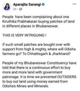 ଭୁବନେଶ୍ୱର ସାଂସଦ ଅପରାଜିତା ଷଡ଼ଙ୍ଗୀ ଆଜି ନିଜ ଟ୍ୱିଟ୍ ମାଧ୍ୟମରେ ତଥ୍ୟ ଦେବା ସହ ସରକାରୀ ପ୍ରୋତ୍ସାହନରେ ଏସବୁ ଜମି କିଣାଯାଇଥିବା ଅଭିଯୋଗ କରିଛନ୍ତି ।