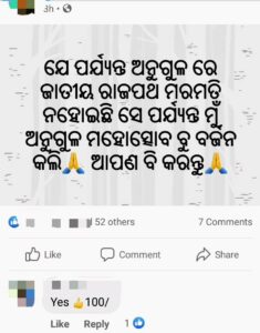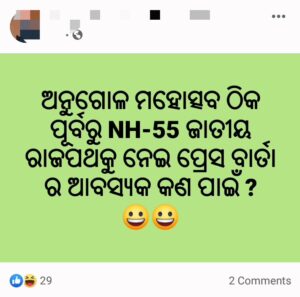 କିନ୍ତୁ ଅସଲ କଥାଟି ହେଲା ଅନୁଷ୍ଠିତ ହେବାକୁ ଯାଉଥିବା ଅନୁଗୁଳ ଜିଲ୍ଲା ମହୋତ୍ସବ ପାଇଁ ବିପୁଳ ପରିମାଣର ଅର୍ଥ ଖର୍ଚ୍ଚ ହେଉଥିବା ଜଣାଯାଏ।ଏପଟେ ସେହି ଅନୁଗୁଳ ଜିଲ୍ଲା ମଧ୍ୟ ଦେଇ ଯାଉଥିବା ଜାତୀୟ ରାଜପଥ ନମ୍ବର ୫୫ ର ଅବସ୍ଥା ଅନେକ ଦିନ ଧରି ଶୋଚନୀୟ ହୋଇ ରହିଛି, ଯାହା ଫଳରେ ପ୍ରାୟତଃ ସେହି ରାଜପଥରେ ଦୁର୍ଘଟଣା ଘଟି ବହୁ ମୂଲ୍ୟବାନ ଜୀବନ ଶେଷ ହୋଇଯାଉଛି।ପ୍ରତିକାର ସ୍ୱରୂପ ଏହି ରାଜପଥର ମରାମତି କରି ମୂଲ୍ୟବାନ ଜୀବନ ଗୁଡିକୁ ବଞ୍ଚାଇବାକୁ ବିଭିନ୍ନ ଆଗଧାଡ଼ିର ରାଜନେତା, ସଂଗଠନ, ଖବର ପରିବେଷଣ ସଂସ୍ଥା ଆଦି ପକ୍ଷରୁ ଅନେକ ବାର ଅନୁରୋଧ ଓ ଧାରଣା ପ୍ରଦର୍ଶନ କରାଯାଇଥିଲେ ମଧ୍ୟ ଜିଲ୍ଲା ପ୍ରଶାସନ ଏବଂ ଭାରତ ସରକାରଙ୍କ ରାଷ୍ଟ୍ରୀୟ ରାଜମାର୍ଗ ପ୍ରାଧିକରଣ ପକ୍ଷରୁ ନାନା ବାହାନା ଓ ଖାଲି ମିଛ ଧାର୍ଯ୍ୟ ସମୟସୀମା ମିଳିଆସୁଛି।
