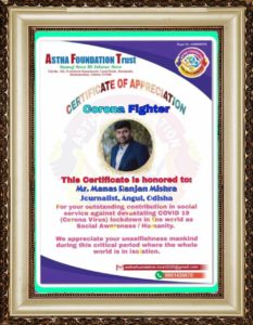 ସେମାନଙ୍କ ମଧ୍ୟରୁ କିଛି ଦିନରାତି ଏକ କରି ଖବର ସଂଗ୍ରହ କରି ଲୋକଙ୍କ ପାଖରେ ପହଞ୍ଚାଇବା ଏବଂ ସେମାନଙ୍କୁ ସଚେତନ କରିବା କାର୍ଯ୍ୟରେ ନିଜକୁ ନିୟୋଜିତ କରିଛନ୍ତି।ଏପରି ଜଣେ ବୈଦ୍ୟୁତିକ ଗଣମାଧ୍ୟମ ପ୍ରତିନିଧି ହେଲେ ଅନୁଗୋଳ ଜିଲ୍ଲାରେ କଳିଙ୍ଗ ଟିଭିର ଜିଲ୍ଲା ପ୍ରତିନିଧି ଭାବେ କାର୍ଯ୍ୟକରୁଥିବା ଯୁବ ସାମ୍ବାଦିକ ମାନସ ରଂଜନ ମିଶ୍ର ଯାହାଙ୍କୁ ଆସ୍ଥା ଫାଉଣ୍ଡେସନ ଟ୍ରଷ୍ଟ,ସମ୍ଭବ ଚାରିଟେବୁଲ ଟ୍ରଷ୍ଟ ଓ ସମର୍ପଣ ଚାରିଟେବୁଲ ଟ୍ରଷ୍ଟ କରୋନା ଯୋଦ୍ଧା ସମ୍ମାନ ରେ ସମ୍ମାନିତ କରିଛନ୍ତି।କରୋନା ମୁକାବିଲା କରିବା ପାଇଁ ନିଜ ଜୀବନକୁ ବାଜି ଲଗାଇ ପରିବାରର ମୋହମାୟା ଛାଡି ଯେଉଁମାନେ ଜନସାଧାରଣଙ୍କ ସେବା କରିବା ପାଇଁ ଆଗେଇ ଆସିଛନ୍ତି ସେମାନେ ହେଉଛନ୍ତି ପ୍ରକୃତ କରୋନା ଯୋଦ୍ଧା।ଏହିପରି ସଂମାନ ସେମାନଙ୍କ ମନୋବଳ ବୃଦ୍ଧି କରିବାରେ ସହାୟକ ହେବ।